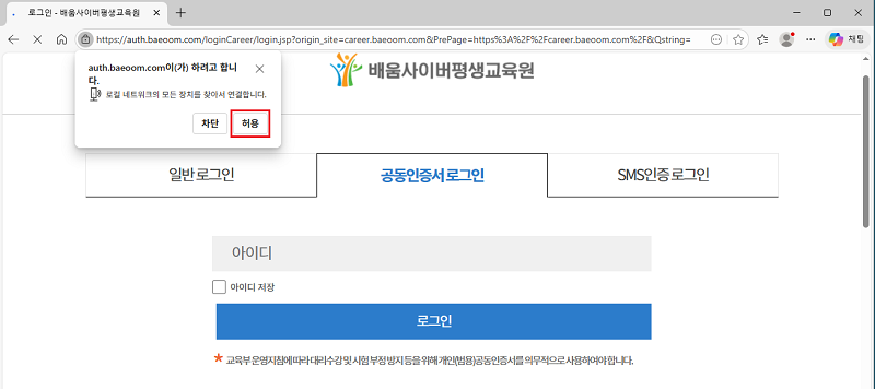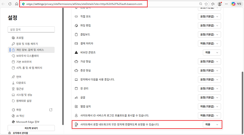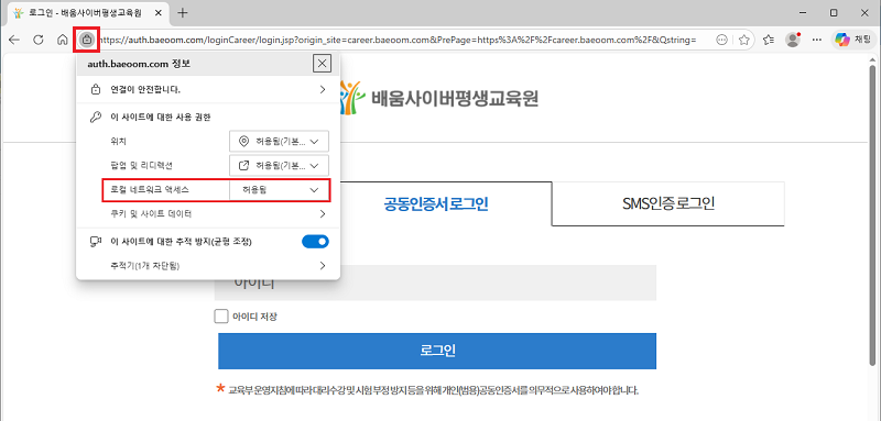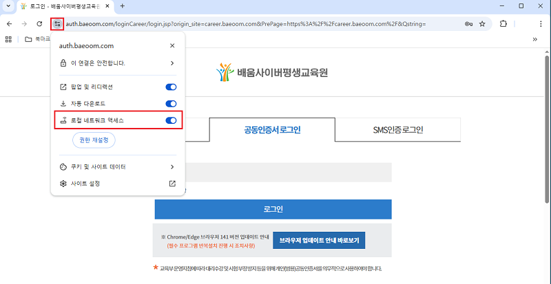 STEP 03 ·ÎÄà ³×Æ®¿öÅ© ¾×¼¼½º ¿É¼ÇÀÌ º¸ÀÌÁö ¾Ê´Â °æ¿ì ¢º Å©·Ò Chrome ¼³Á¤ 1) ¾Æ·¡ ÁÖ¼Ò¸¦ º¹»çÇØ¼ »çÀÌÆ® ÁÖ¼Òâ¿¡ ºÙ¿©³Ö±â chrome://settings/content/siteDetails?site=https%3A%2F%2Fauth.baeoom.com%2F 2) ·ÎÄà ³×Æ®¿öÅ© ¾×¼¼½º¸¦ [Çã¿ë]À¸·Î º¯°æ ¢º ¿§Áö Edge ¼³Á¤ 1) ¾Æ·¡ ÁÖ¼Ò¸¦ º¹»çÇØ¼ »çÀÌÆ® ÁÖ¼Òâ¿¡ ºÙ¿©³Ö±â edge://settings/privacy/sitePermissions/allSites/siteDetails?site=https%3A%2F%2Fauth.baeoom.com 2) ·ÎÄà ³×Æ®¿öÅ© ¾×¼¼½º¸¦ [Çã¿ë]À¸·Î º¯°æ