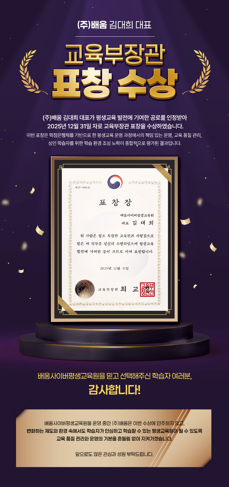 | Á¦¸ñ | (ÁÖ)¹è¿ò ±è´ëÈñ ´ëÇ¥ ±³À°ºÎÀå°ü ǥâ ¼ö»ó ¾È³» | |